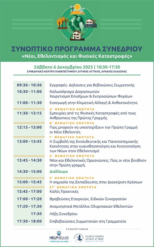 Ο Συντονιστής της Εθνικής Μονάδας Συντονισμού ΙΝΕΔΙΒΙΜ, Βασίλης Παναγόπουλος, συμμετείχε στο Συνέδριο «Νέοι, Εθελοντισμός και Φυσικές Καταστροφές», που πραγματοποιήθηκε στις 6 Δεκεμβρίου 2025, με αφορμή την Παγκόσμια Ημέρα Εθελοντισμού. Το συνέδριο, μια σημαντική συνδιοργάνωση του Πανεπιστημίου Δυτικής Αττικής και της Ακαδημίας Εθελοντισμού HELPHELLAS, έδωσε την ευκαιρία σε φορείς, ειδικούς και νέους να ανταλλάξουν εμπειρίες και να αναδείξουν τον κρίσιμο ρόλο του εθελοντισμού στην αντιμετώπιση σύγχρονων προκλήσεων.